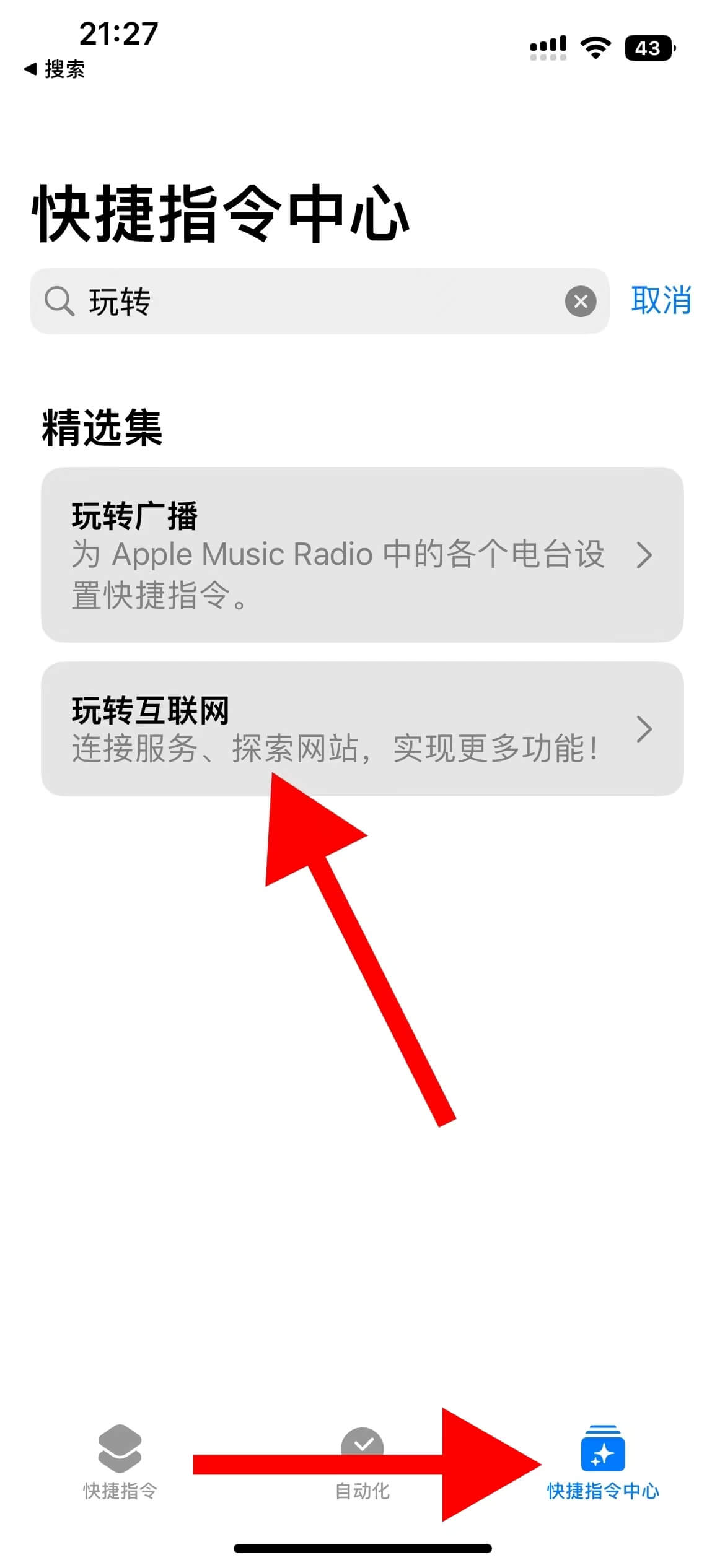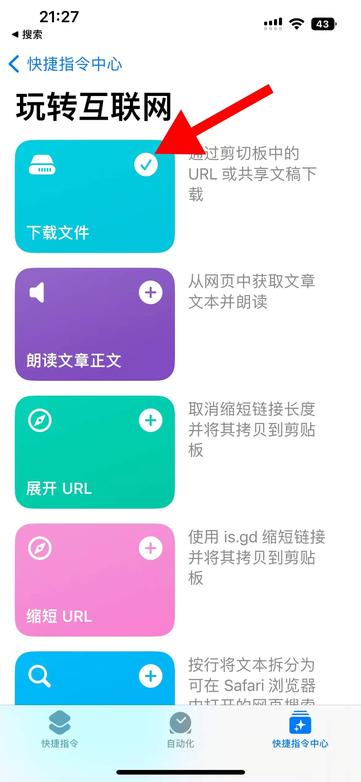 第二步、打开快捷指令,点击右下方【快捷指令中心】,搜索找到标题【玩转互联网】,找到下载文件的功能,点击添加【+】