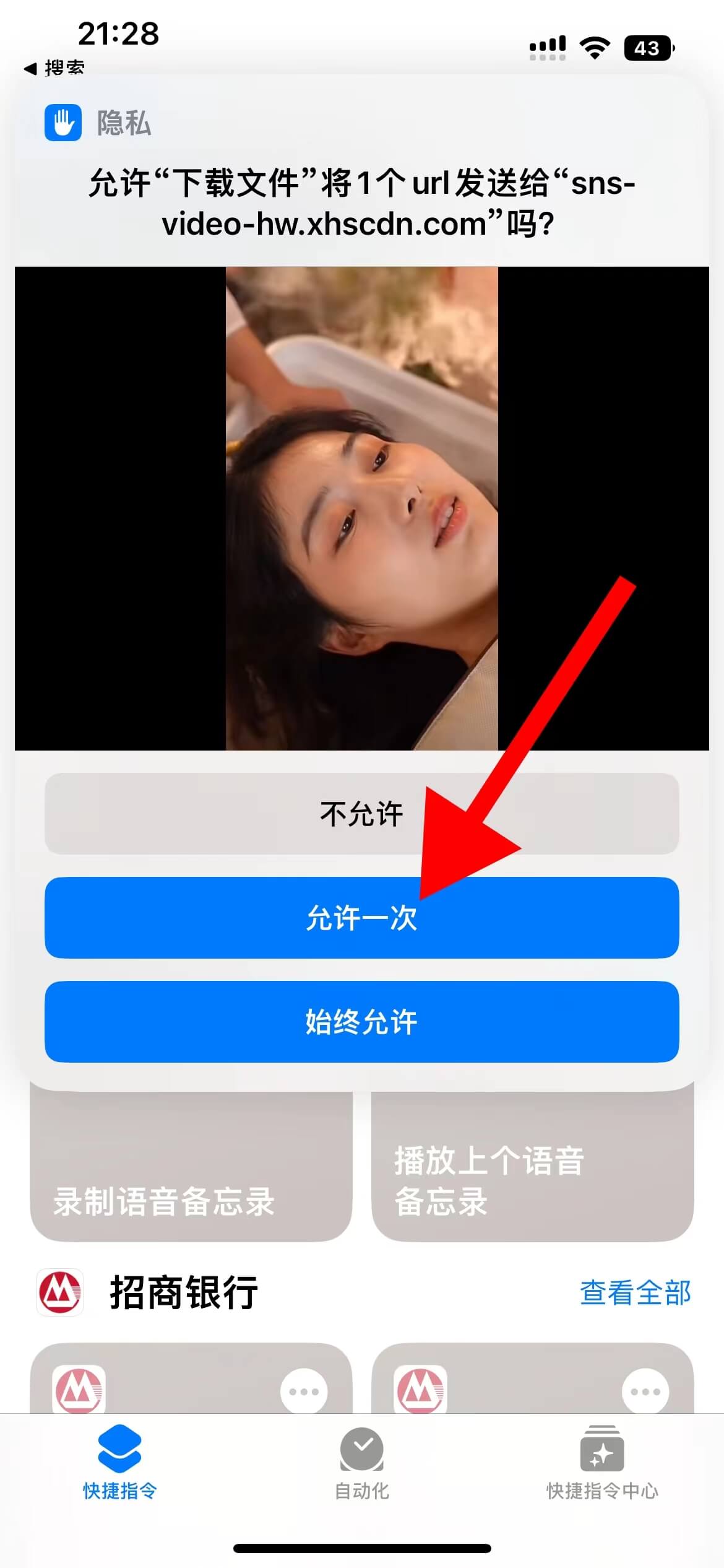 第三步、通过复制本网站解析获得视频下载链接,然后回到【快捷指令】首页,点击【下载文件区域】弹出提示下载链接视频,点击【允许一次】开始下载