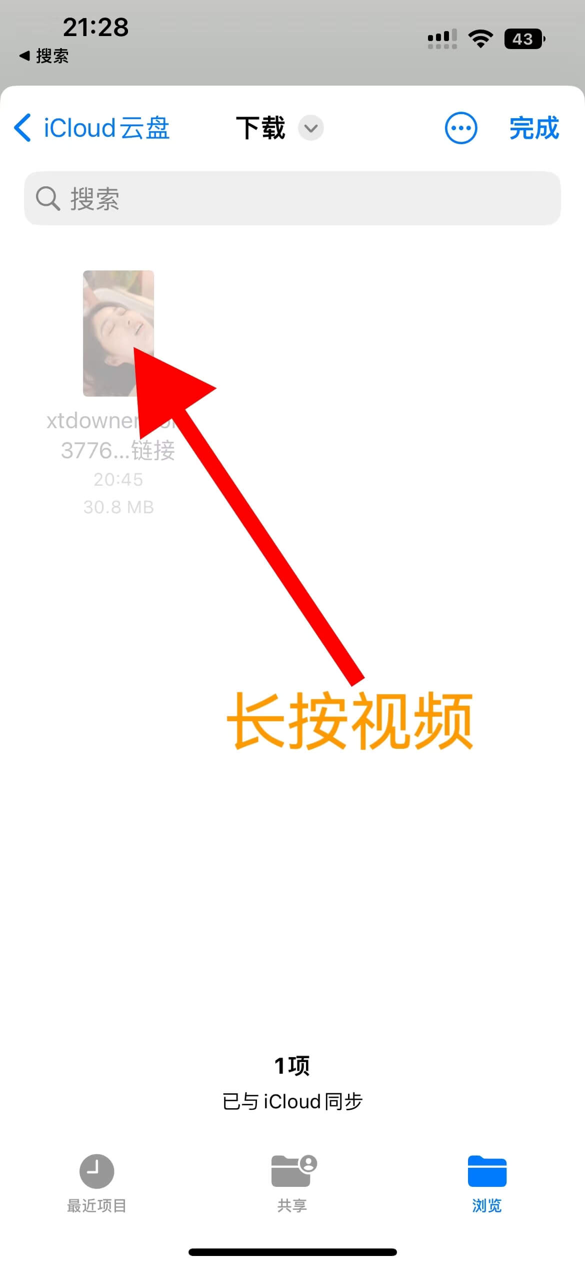 第四步、视频下载完成后,弹出弹窗在【浏览】里面选择【下载】,长按视频