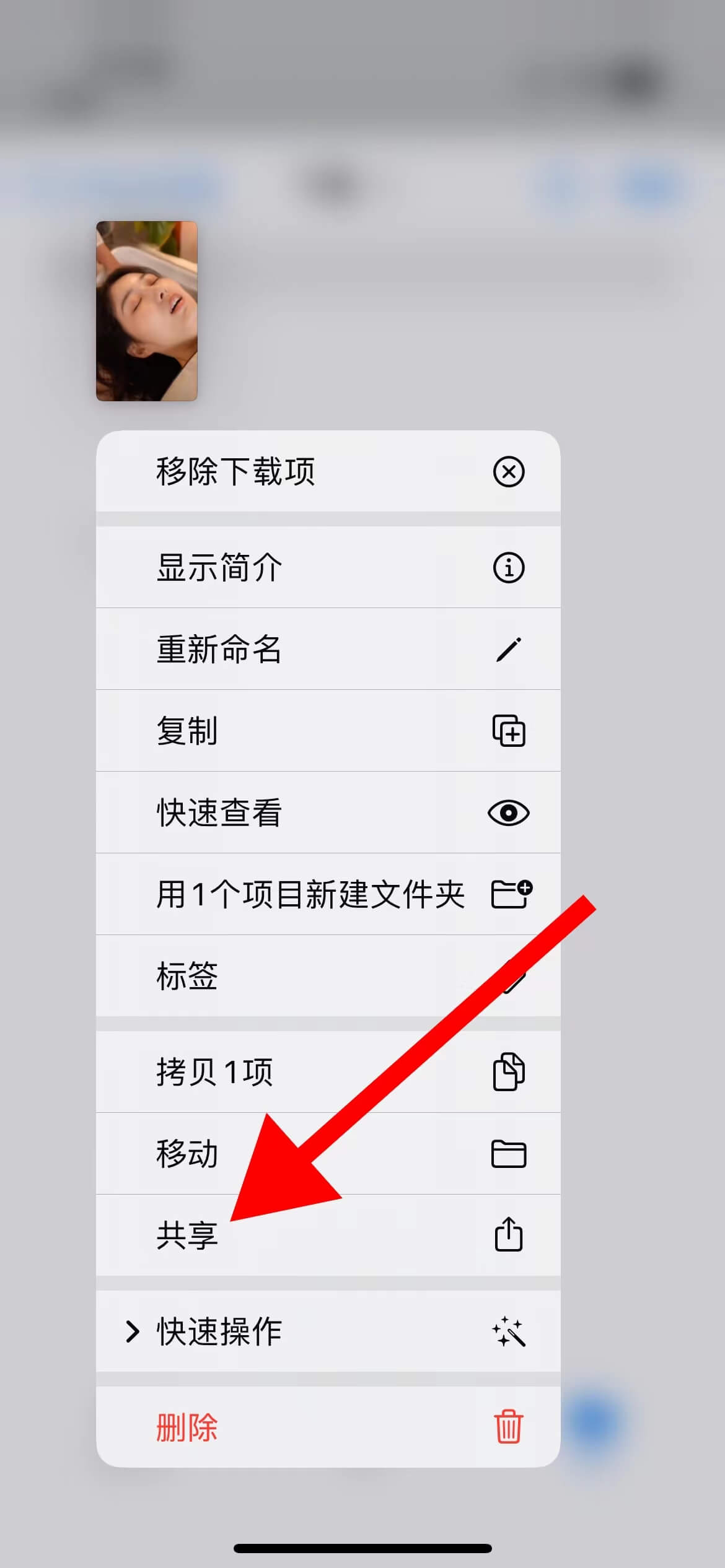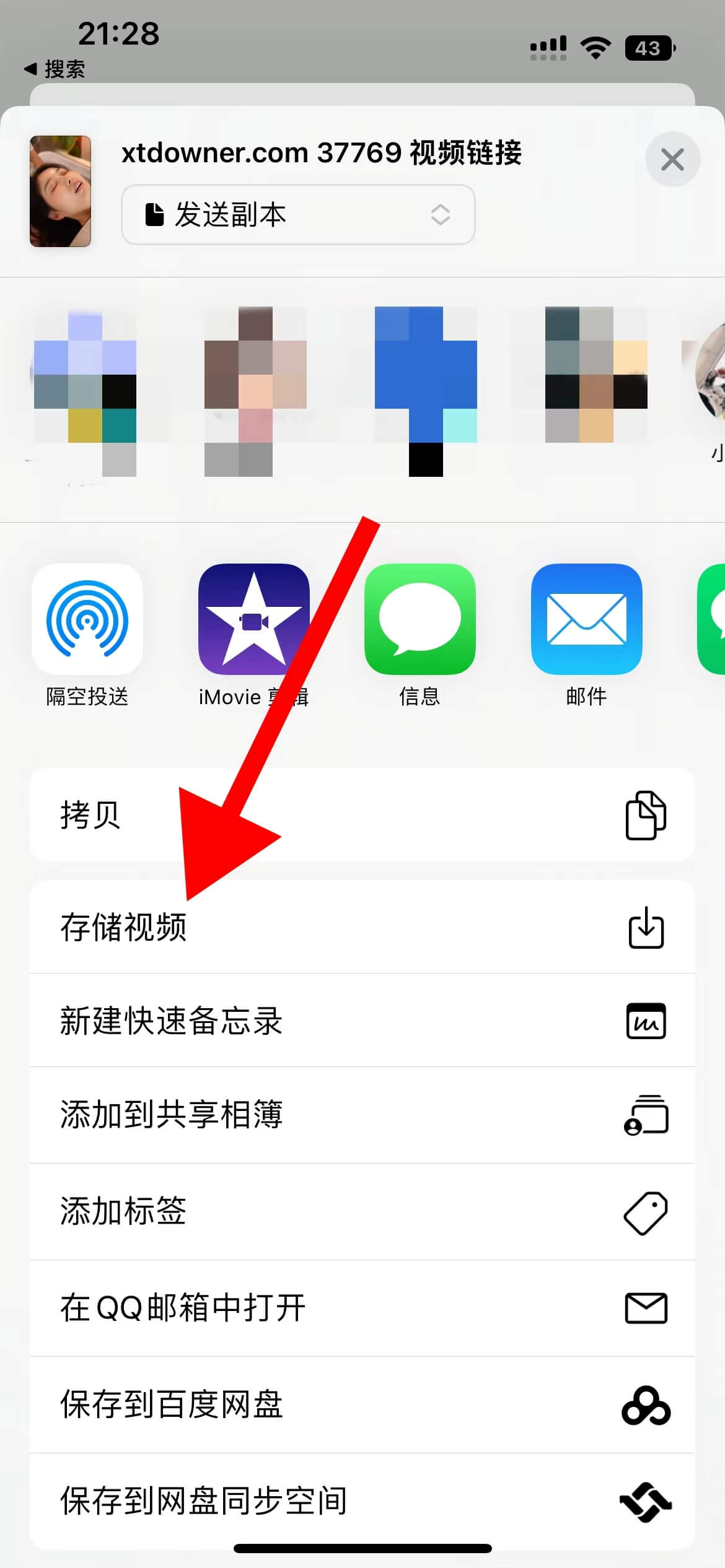 第五步、长按视频后会出现如图下方点击【共享】,【存储视频】就可以在手机【照片】里找到下载好的视频了