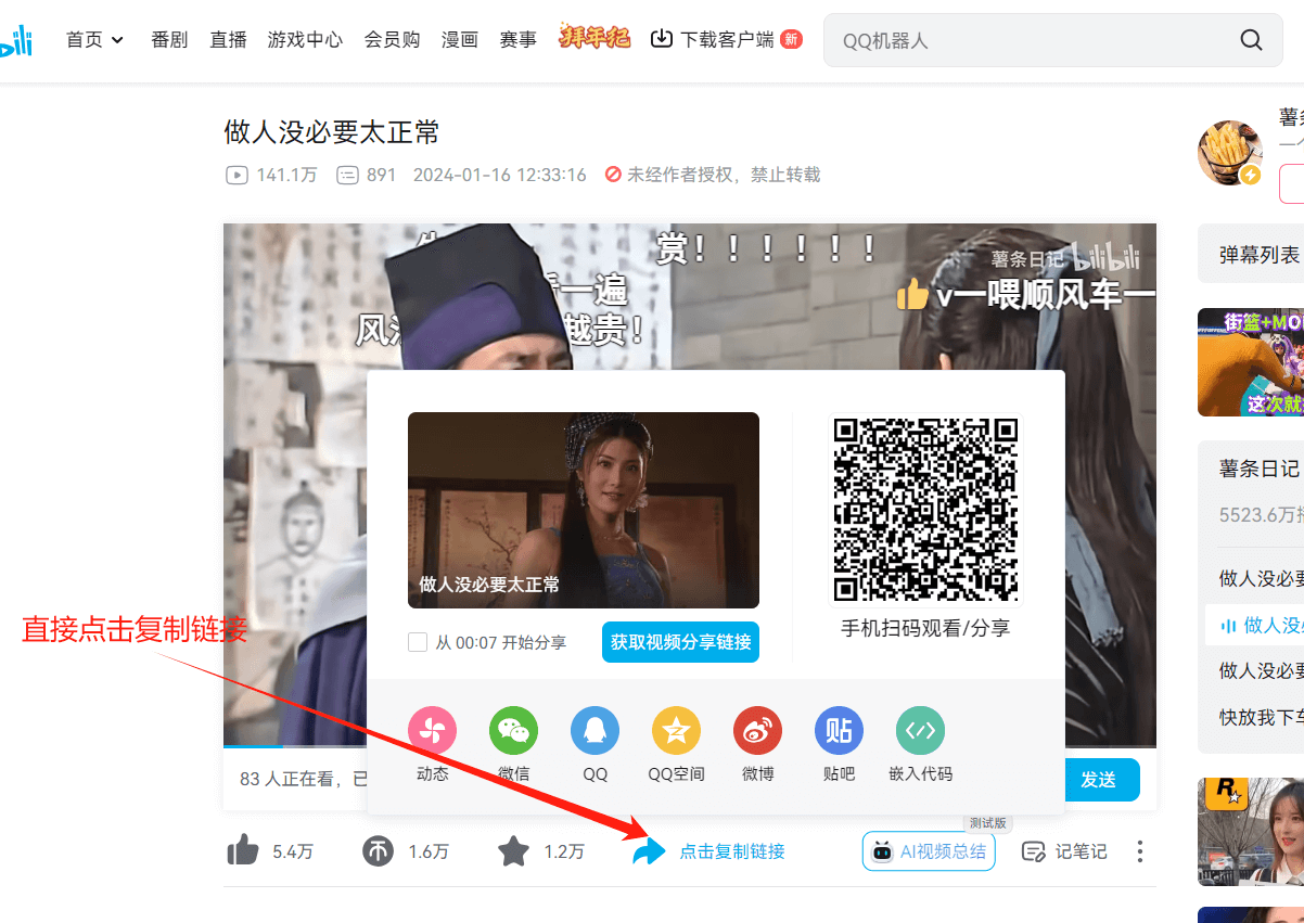 下载无水印视频/图片,可以直接使用我们的工具进行下载,只需要将要下载视频的分享链接复制到该工具一键获取即可。下面介绍怎么获取电脑端短视频网站的链接,如果电脑端没有对应的官网,就只能去手机端进行复制。以下示例哔哩哔哩官方为例(注意:必须是分享链接)
