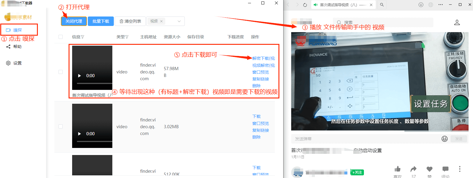 注意1:先打开代理,再播放视频,即可出现要下载的视频(注意图中提示文字)